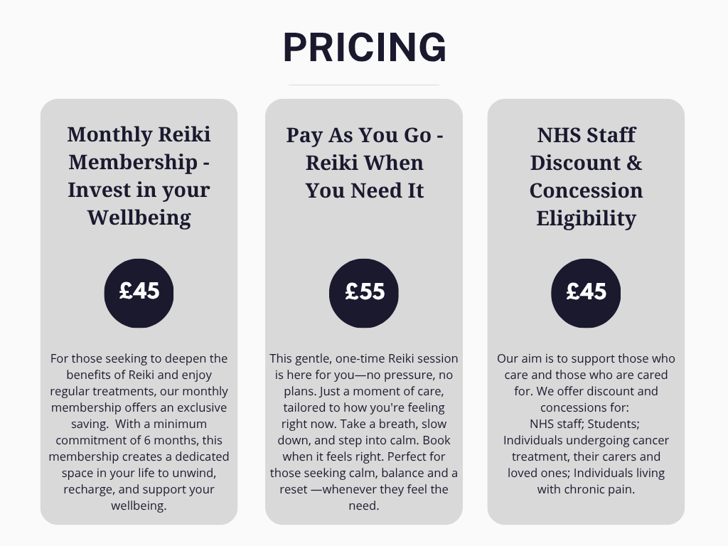 My treatment fees are thoughtfully set to reflect the depth of my training, experience, and expertise. They also support the provision of a dedicated Reiki Room—an inviting, tranquil space designed for your comfort and relaxation. I’m committed to offering a high level of care, empathy, attentive listening, and meaningful support to everyone I work with.